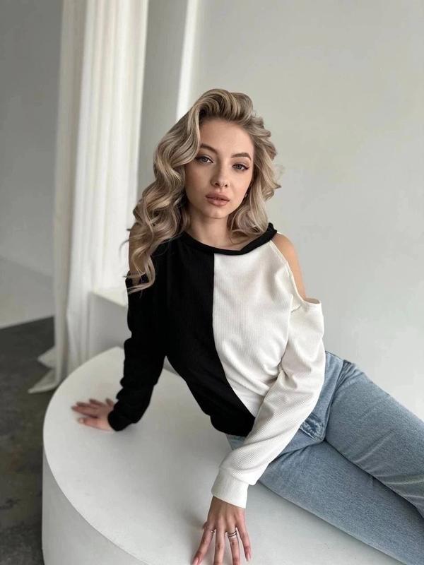 Кофта Розмір см , лхл Колір біло чорний Модна, стильна кофта з відкритими плечами Можна носити зі спідницею , брюками та джинсами Якість 💣💣💣