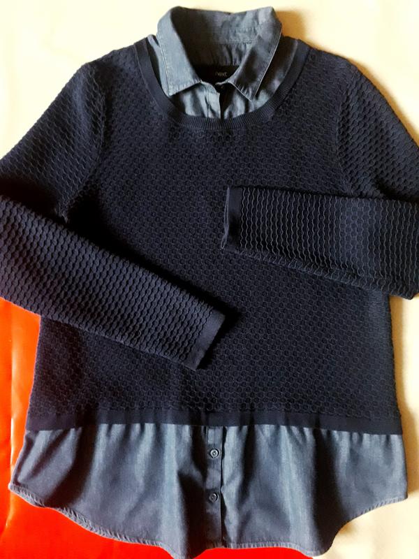 Джемпер обманка .Колір синій та блакитний.На третьому фото на рукаві з обох сторін дефект.