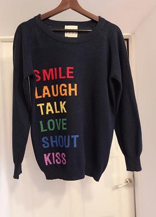 Оригінальний кашеміровий джемпер темно-синього кольору з яскравими надписами. Виробництво Монголія. Стан ідеальний без нюансів. Розмір орієнтовно S, М . Заміри пог 50 см, довжина 62 см, рукав реглан довжина від шва під пахвами 44 см.