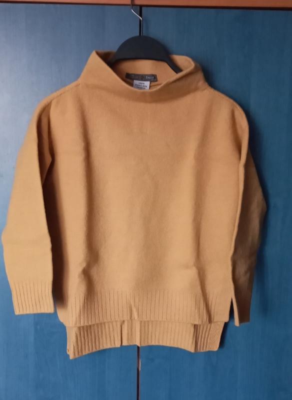 джемпер з широкою горловиною. по боках високі розрізи. перед коротший за спинку. заміри: плечі 45см, під пахвами 45см, довжина по переду 46см, довжина по спинці 52см, рукав 3/4 довжина 37см. 100% вовна лами, не колеться. колір , як на перших фото. італійський бренд Riva tricot