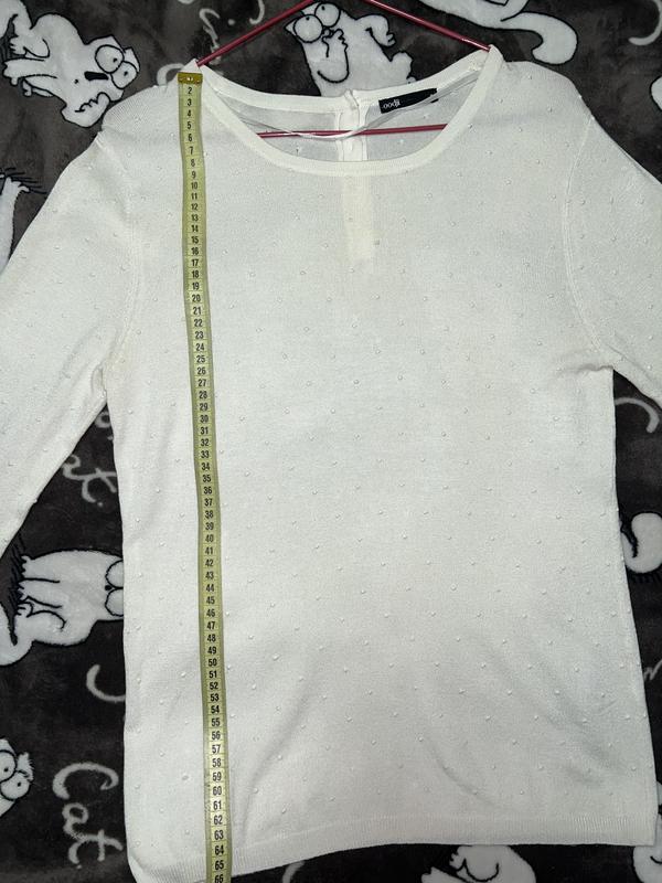 Кофта біла, з білими пупирками, ззаді має гудзики, рукав 3/4.