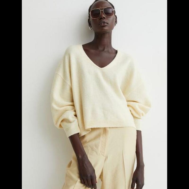 ❤️Чудовий оверсайз джемпер, кофта від H&M, розмір S. Колір вершкового масла. Заміри просто в розкладеному вигляді: ПО під пахвами - 57 см. ПО низу - 52 см. Довжина - 54 см. Довжина рукава - 47 см. Довжина плеча - 18,5 см. (занижен) Тканина: 52% поліестер, 41% акрил, 4% вовна, 3% еластан.