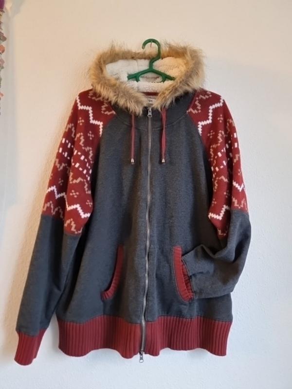кофта на блискавці, в ідеальному стані. капюшон зсередини зі шт.хутром, м,якенький. оригінальне поєднання двох структур полотен. заміри: ног-62, но ширини низу-60( резинка) , ширина резинки-8.5 довжина рукава з плечем-75. кишені-" кенгуру"