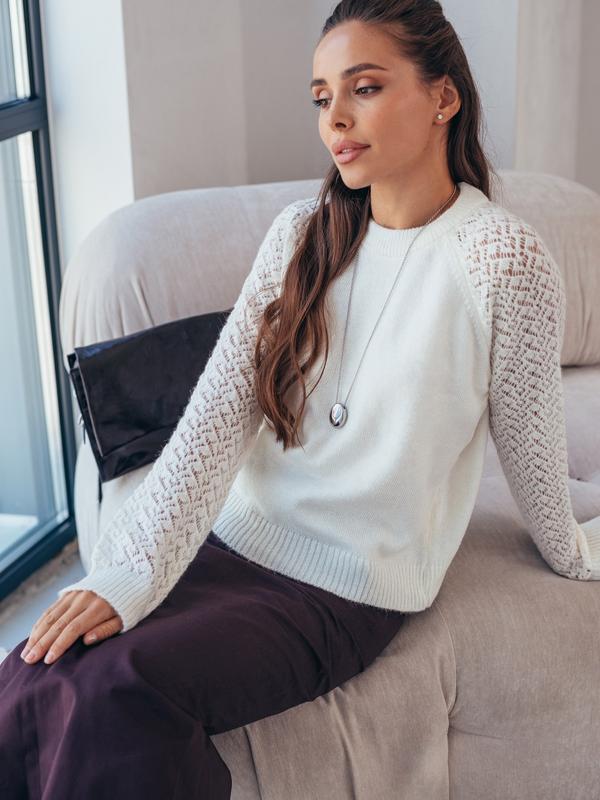 🔥В'язаний джемпер із високоякісного турецького матеріалу. Виріб дрібної в'язки. Рукави-реглан з перфорацією. Горловина, манжети та низ зв'язані гумкою ✔Розмір 44-48 🪡довжина виробу – 53 см 🪡довжина рукава (від горловини) – 71см. 🪡Об'єм грудей:94-104 🍂Склад: 37% поліестер, 33% акрил, 30% бавовна 🍂Матеріал: Акрил 🎊Колір: молочний,бежевий 💳Ціна 1200грн Арт901590 ‼️Кількість обмежена