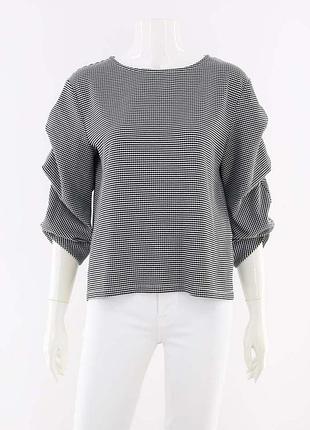 Блуза трикотажна в чорно білому принті від німецького бренду Someday. Тканина щільна, злегка об'ємна. Рукав драпірований з внутрішньої сторони. Склад: 64% поліестер, 33% віскоза, 3% эластан Заміри ШП 42, ширина 60, довжина 62 см