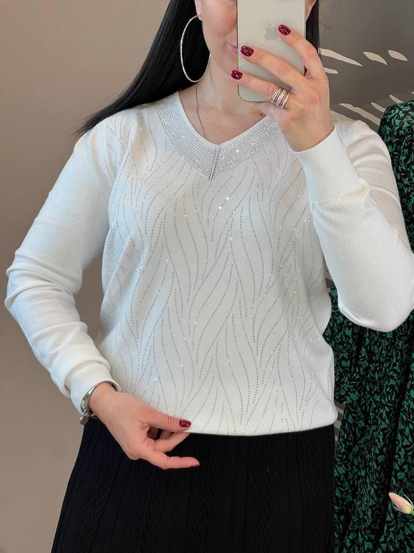 неймовірно красивий і приємний до тіла светр вільного крою з ніжного кашеміру, прикрашеного чарівним візерунком з блискучих страз, матиме чудовий вигляд на вас на роботі та відпочинку светр оверсайз з витонченим вирізом на грудях, на гумці внизу і рукавах добре продемонструє красу вашої фігури і займе гідне місце у вашому гардеробі розмір 44-48 довжина 60 см, пг 52-53 см добре тягнеться, довжина рукава від шиї 67-68 см код 0655