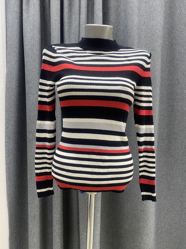 Плечи 34 см Рукав от плеча / от подмышки - 58 см / 43 см Пог 38см, тянется до 60+ см Пот 33-60+ см Длина 53 см джемпер с длинными рукавами и высоким круглым воротом. Он имеет облегающий крой и выполнен в полосатом дизайне с черными, белыми, красными горизонтальными линиями. Такая модель хорошо подходит как для повседневной носки, так и для создания стильных образов.