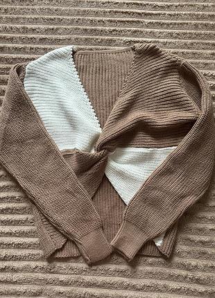 Вʼязаний абсолютно новенький джемпер, з декоративним вузликом спереду, двоколірний - коричневий з молочним. Заміри: Довжина по спинці - 50 см Довжина рукава - 58 см По грудях - 52 см (тягнеться) Підійде на розмір S-M.