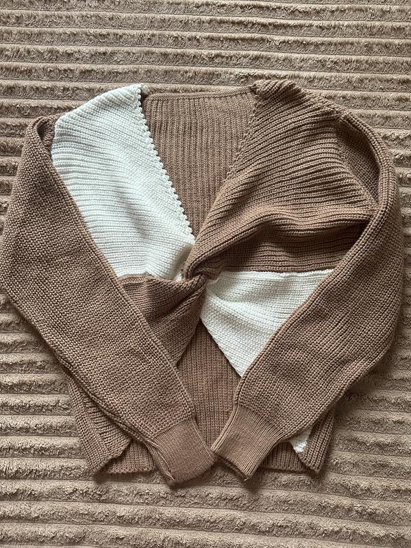 Вязаный абсолютно новенький джемпер, с декоративным узелком спереди, двухцветный - коричневый с молочным. Замеры: Длина по спинке - 50 см Длина рукава - 58 см По груди - 52 см (тянется) Подойдет на размер S-M.