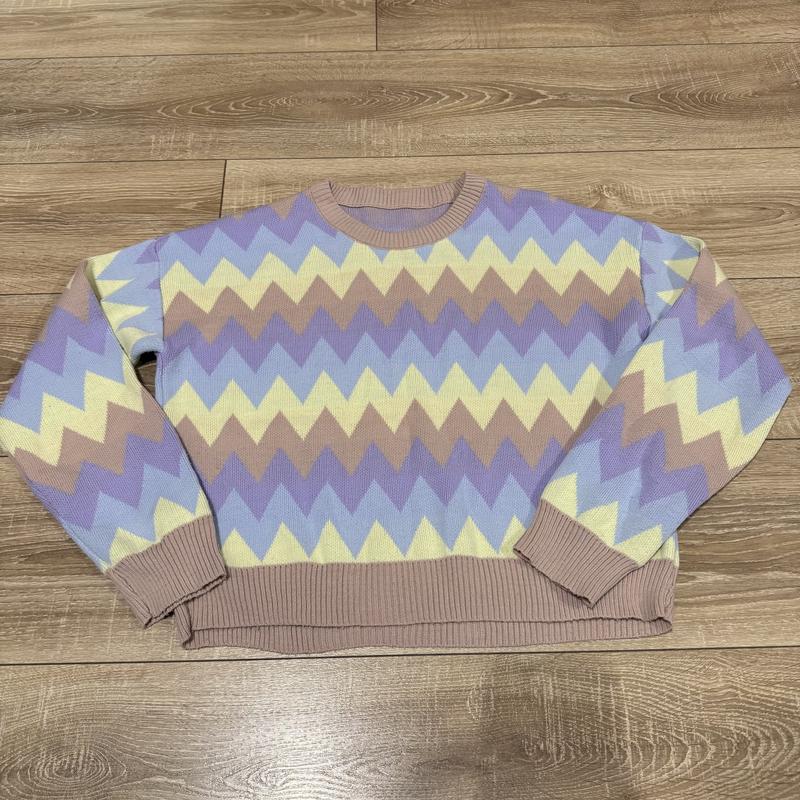 Різнокольоровий джемпер зі спущеним рукавом розміру S-M з малюнком зиг-заг 50%котону, 50% акрилу Стан ідеальний. Довжина 53 Ог 53 Довжина рукава від горловини 70 см