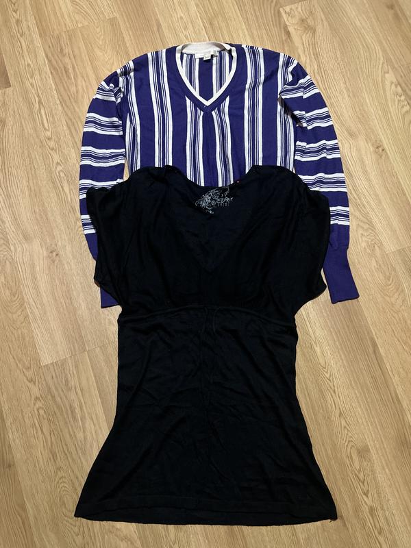 Стильный комплект из нежного джемпера в полоску от Marc Jacobs и свободной черной туники Emprit. Джемпер мягкий, приятный к телу, отлично сидит по фигуре. Туника свободного кроя с шикарным регулируемым V-образным вырезом под грудью — создаёт лёгкий и элегантный образ. Идеально подойдут для комфортного и стильного повседневного образа. Джемпер на с-м. Туника на с-л.