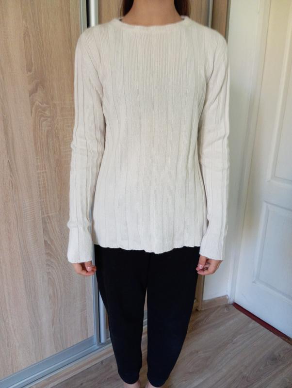 Колір молочний. М'який, приємний до тіла.. Плече 11, рукав подовжений 70, спина 42, довжина 66, НОГ 53. Зріст моделі 170 см, розмір S, на неї великий.