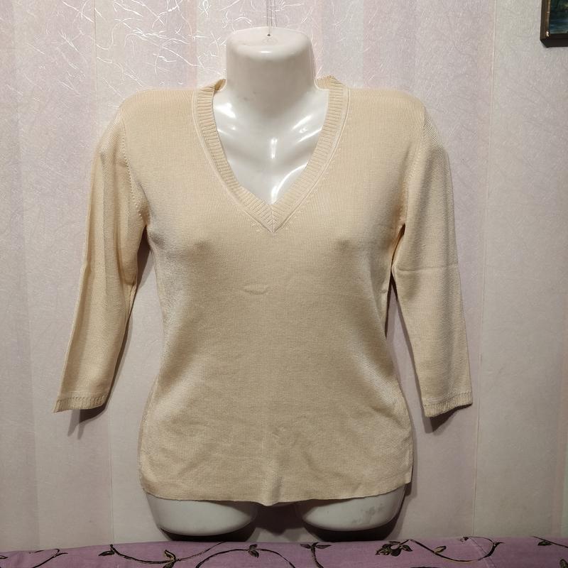 Чудової якості, шовковистий, з відливом, віскозний джемпер. Стан чудовий. Замітка на останній світлині: на шиї, ззаду, біля бирочки, були спущені петельки, я підшила, рейтинг акуратно. Колір світло-бежевий. Розмір і склад на фото. Заміри: Довжина 55 см ПОГ 40-50+ см НОТ 35+ см Низ 39-55+ см Рукав 42 см Плече 10 см