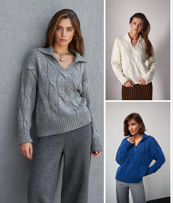 Джемпер поло виконаний з ніжної напіввовняної пряжі в трендовій кольоровій гамі. Виріб середньої товщини зв´язаний фактурним переплетенням "коси". Комфортного об´єму джемпер має спущений рукав на манжеті та горловину-поло. Довжина близько 58-59 см (+-2 см). Ширина під проймою та у талії в спокійному нерозтягнутому стані 53-58 см. В розтягнутому стані 58-63 см. Ширина по низу в спокійному нерозтягнутому стані 44-46 см. В розтягнутому стані 54-56 см. Довжина рукава 47-46 см. Ширина плеча 20-22 см. Висота коміру 14 см. Висота манжети 9 см. Склад та догляд 50% - ВОВНА 50% - АКРІЛ-СОФТ