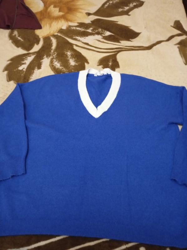 Чудовий жіночий светерок синього кольору з білим комірцєм, дуже приємний до тіла 50%-віскози, останні поліестер. Оверсайз. Розмір 16, але заміри на більший розмір-18-20. Заміри: ПОГ-66, довжина -70, плечі приспущені-70, рукав-44. Стан ідеальний.