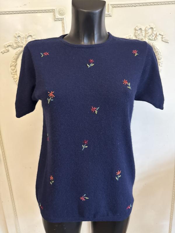 Колір темно-синій. Машинна вишивка квітів по переду. Вовна-100/. Розмір по бірці-М. Заміри: довжина-62 см, ПОГ-45 см, ПОБ-42 см. Стан ідеальний.