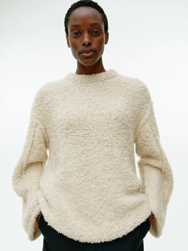 Джемпер вільного крою, виготовлений з екологічно чистої суміші вовни (сертифікат RWS C815571RAF-01.2021). Розроблений з інвертованою строчкою для ефекту зворотної текстури. Вовна 91%, Перероблений поліамід 9% XS CN 160/80А Плечі 50 см Рукав 54 см ПОГ 52 см Довжина 67 см Паперові бірки відсутні