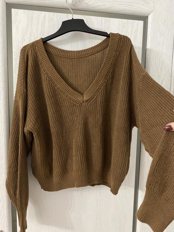 Шоколадного цвета, классный, свободный джемпер, хлопок и акрил. Очень приятный тактильно. Хорошо тянется. Длина 60. Рукав от шва 57, от горловины 81. Пройма 24, ПОГ 66. Пот 61, тянется до 77. Снизу 46