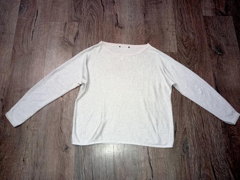 трикотажний джемпер з люрексовою наткою,красивого бежево пудрового кольору на розмір 54-56,заміри ог 66-72см,довжина 69см ,тканинка віскоза приємна до тіла ,красива базова річ -рккомендую!