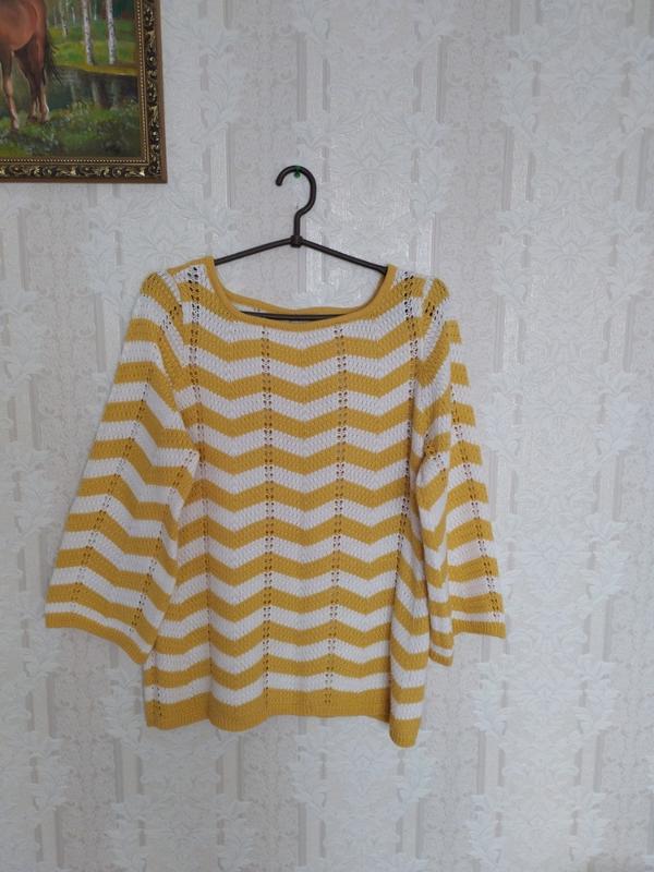 Свитер в идеальном состоянии.Желто-белая полоска. Фигурный низ.Хорошо сядет на размер S/M Замеры: длина -60 см ширина плеч -34 см пог-52 см длина рукава -50 см(3/4)