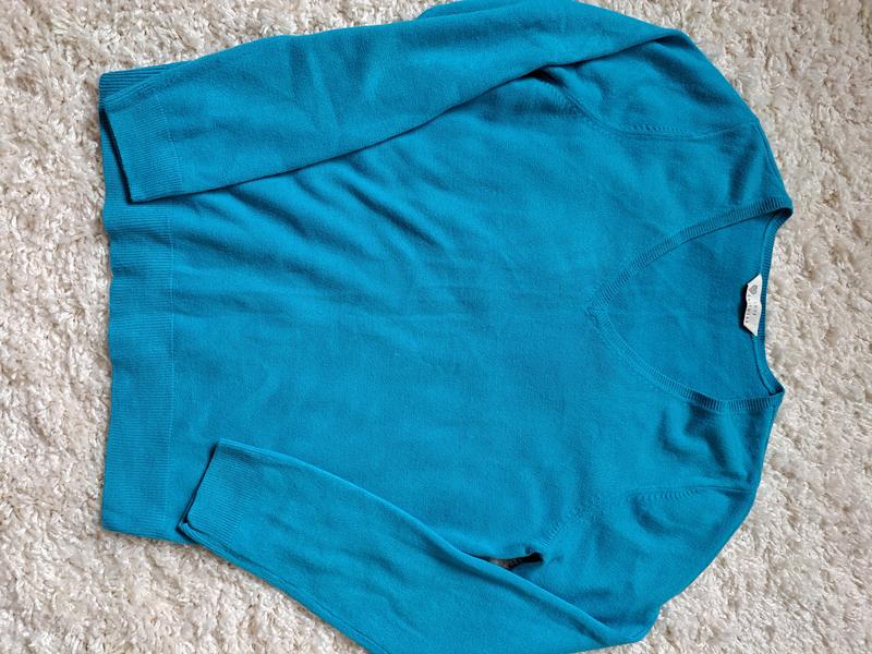 Кофта трикотажна дуже красивого ярко-блакитного кольору, легка. Добре тягнеться, нюансів немає.