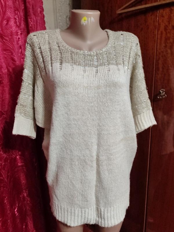 В ідеальному стані, тканина приємна до тіла, м'яка і пухнаста,на фото показала.Камера не передає реального блиску паєток .Пог-68см(реглан), пот-48см, довжина рукава від горловини- 45см, довжина виробу -72см.Тканина добре тягнеться.Є ще багато чого цікавого, підписуйтесь на оновлення.Всі питання пишіть на сайті Шафи, додаткову інформацію надам, фото теж.