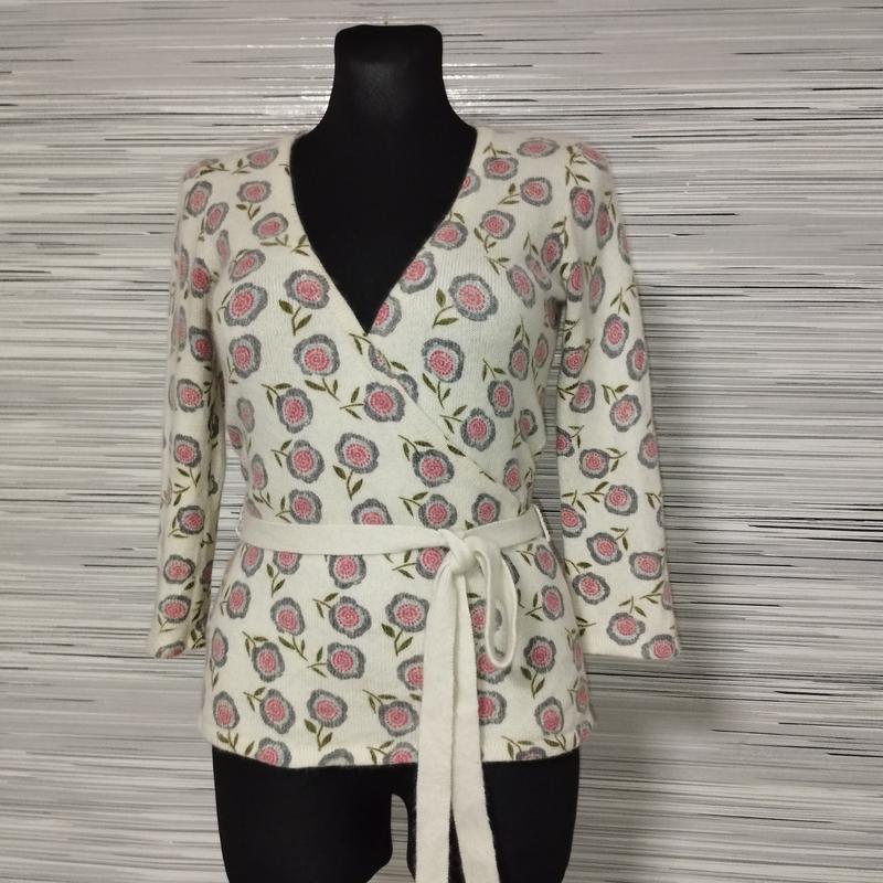 Неймовірно ніжний кремовий джемпер на запах з ангори , квітковий принт, пояс. від Laura Ashley - один із самих популярних англійських брендів,класичний англійський стиль, який включає квіткові візерунки, елегантність та простоту, створюючи атмосферу затишку. розмір S ( манекен розміром М,) заміри в спок стані) довжина 60 см ПОплечі35 см+ ПОГ 40 см+ ПОТ 37 см+ ПОниз 42 см рукав 45 см ( чуть довший як 3\4) 70% нейлон 30% ангора - ніжне,еластичне,шовковисте полотно,м'якеньке,середньої щільності полотно,не рихле,неймовірно приємне тактильно ( таке відчуття,що кашемір) ІДЕАЛЬНОГО СТАНУ