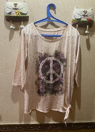 світло-рожева футболка з рукавами три чверті та принтом знака миру з квітковими мотивами. Пог-50 см Довжина -63 см Довжина рукава-43 см #07
