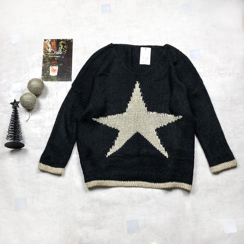 В'язаний светр із золотою зіркою металізованою ниткою та золотими манжетами.