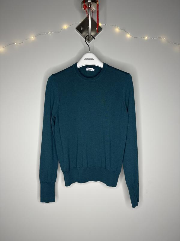Витончений светр Filippa K з 100% натуральної вовни. Колір — глибокий синьо-зелений, благородний відтінок смарагду, який виглядає дорого й поза часом. М’який, приємний до тіла, добре тримає форму. Класичний круглий виріз — універсальний і завжди актуальний, легко вписується як у базовий гардероб, так і в більш зібрані образи. Спокійна лінія плечей без напруги, посадка природна та охайна. Заміри: • плечі (у спокійному стані): 36 см Завдяки еластичності та продуманому крою підійде на XS, S та невелику M. Річ з характером скандинавського мінімалізму: стримана, якісна, розрахована на довгу службу й актуальність незалежно від сезонів. Підписуйтесь.Дивіться мій профіль з рідкісними та унікальними виробами. Тільки преміум тканини і люксові бренди.
