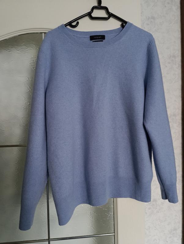джемпер кашеміровий, приємного блакитного кольору, ніжний на дотик. Є невеличкий дефект під рукою - дивіться останнє фото. Дефект у ціні враховано. Довжина 63см, ПОГ 57см, рукав 57см, плече 9,5см.