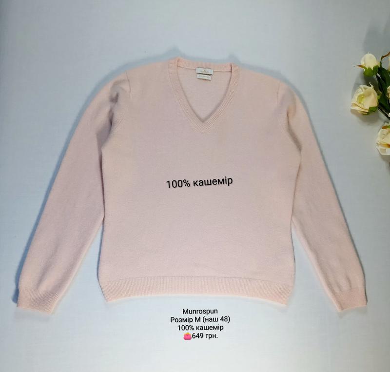 Джемпер кашемир от Munrospun. Размер М (наш 48). Состав 100% кашемир. Замеры: длина по спинке 57 см, ПОГ 50 см, ПОТ 44 см, ПОБ 42 см резинка, плечо 11 см, длина рукава 60 см. Состояние новое.