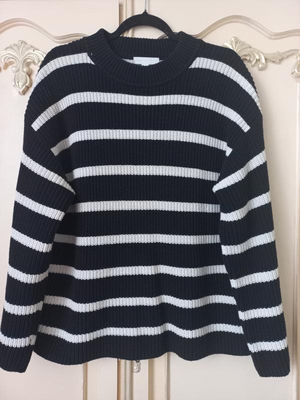 Стильний смугастий джемпер, оверсайз, чорний в молочну полоску , розмір S, підійде і на М, Пог 55см, плечі 57см, рукав від шиї 73см, довжина 65см, плотний, склад: 60% котон, 40% акрил, новий, без паперової бірки.