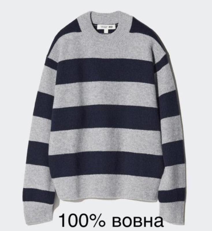 красивый и очень теплый женский джемпер из овечьей шерсти премиум качества из коллекции японского бренда Uniqlo с коллаборации с брендом Comptoir des Cottonnier Связан в полоску разных оттенков серого цвета . С круглым вырезом. Спущенное плечо Состав: шерсть 100% Есть размеры: Л и ХЛ Замеры для : ПОГ = 56 см Длина - 56 см. Длина рукава - 58 см. Ширина плечей - 50 см