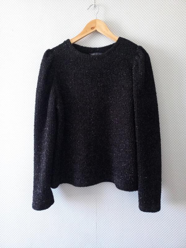 Жіночий джемпер чорного кольору. Виготовлений з ворсистої блискучої пряжі. Рукава призібрані вгорі. Стан ідеальний. Розмір по бірці 14.