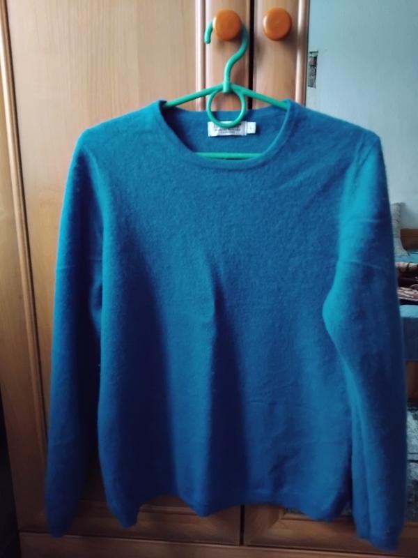 жіночий джемпер,склад 100 % кашемір,розмір М,колір морської хвилі синьо - зелений,камера не зовсім передає,дуже гарний,кашемір м'який та пухнастий,стан ідеальний,нюансів немає.