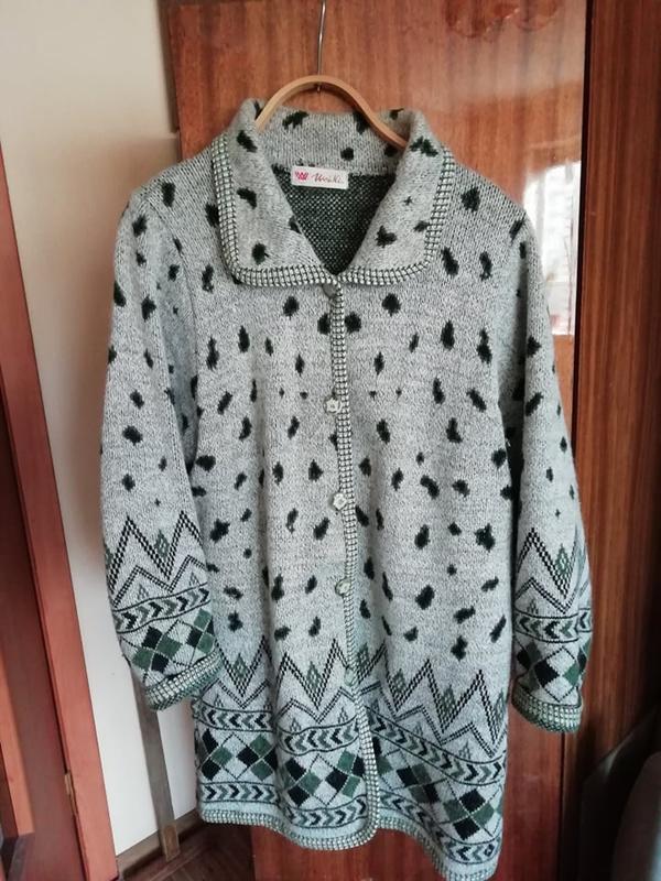 Продам теплу кофту зеленувато - сірого кольору з візерунками, дуже зручну та комфортну. Розмір 50, заміри: довжина по спинці 88см, рукава 60 див. Склад нитки - бавовна з акрилом.