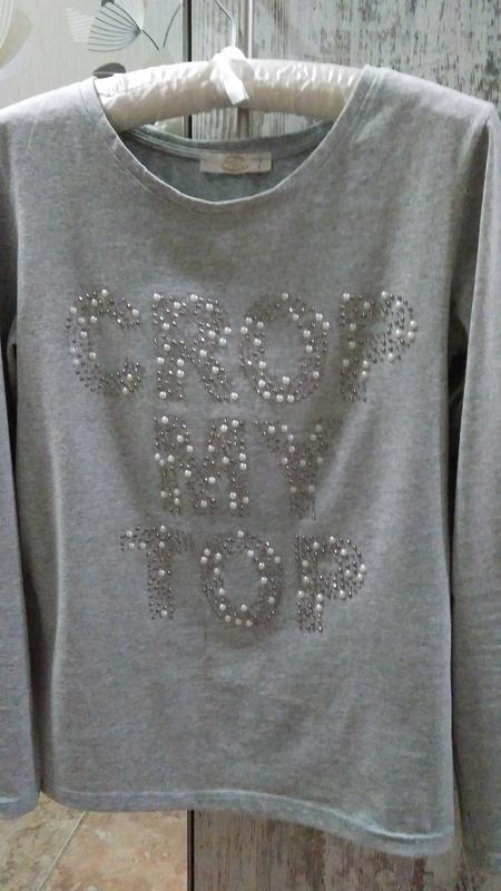 Демісезонний бавовняний лонгслив прямого крою з круглим вирізом горловини. Розтяжність незначна. Декор дуже міцний. Виміри в розкладеному стані: Відстань між плечовими швами 37см, довжина від верхньої точки плеча 59см, відстань по пахв 44 см, довжина рукава 57 см, ширина 15,5 см (мені не комфортно)