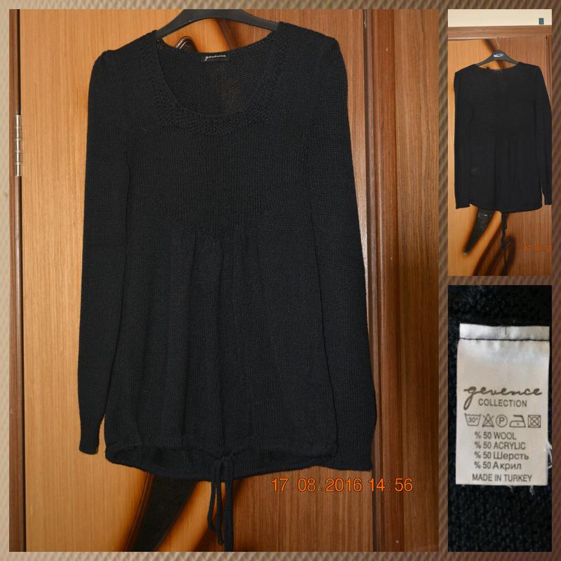 Темносиній в'язаний джемпер. Квадратна горловина. Розширяється до низу, з низу затягується на мотузку. Довжина 65. Розмір 46-48.