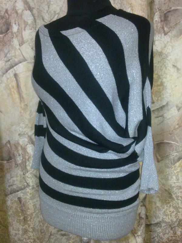 Модельне, подовжена, туніка-асиметрія, у смуги, з люриксовой ниткою на сірій смузі, має оригінальний фасон, з цілісно-кроенными рукавами. Виготовлена в Туреччині, з 76%акрилу, 14%вовни і 10%металік, приємна, м'яка, тепленька в'язка. Розмір 44-46 S/М. Стан відмінний, новий, навісних ярликів немає, стік. РОЗМІР: ПОГ.=51см, ПОТ.=41см, ПОБІДИ.=35см (гумка тягнеться до 48-50см), Длн.=75см. ЛОТИ КОМБІНУЮ!!!