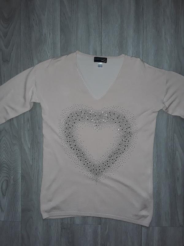 Женская кофта с сердцем из страз по бирке размер ХХЛ. Состояние отличное. Цвет пудра. Длина 64см Рукав 51см Плечи 53см