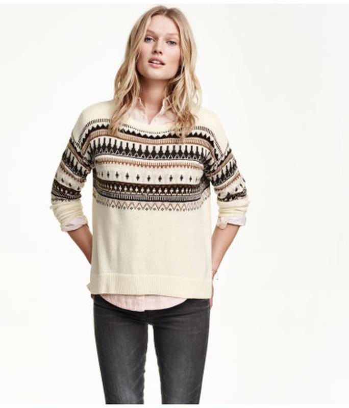 Джемпер Н&М с орнаментом, свободного кроя, линия плеча занижена, перёд короче спинки, р.ХS,но подойдёт и на р.S, состав:50% хлопок, 45% акрил, 5% шерсть. Замеры: ширина подмышек-50, длина рукава от горловины-69, длина переда-54, длина спинки-60 см