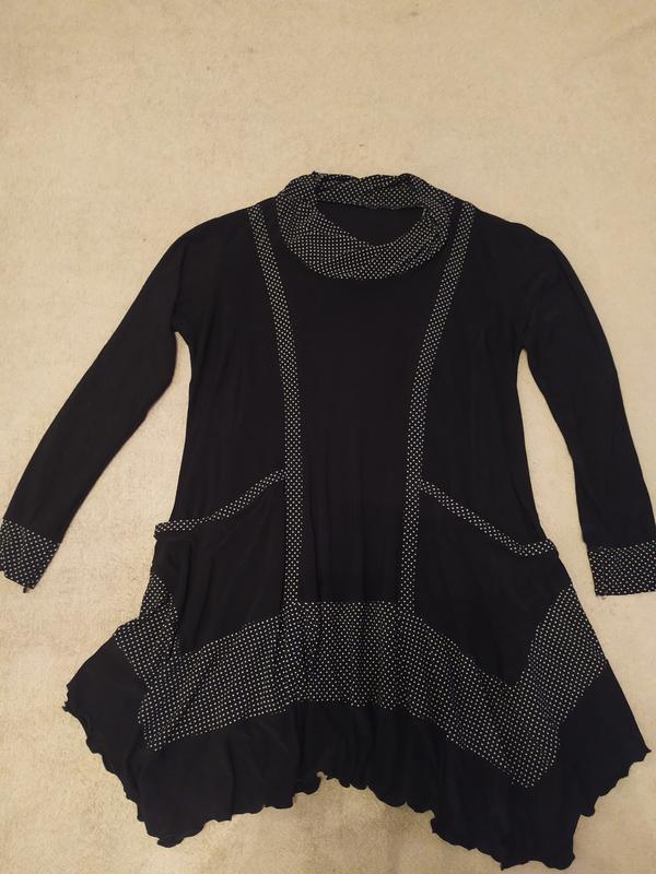 Стильна туніка з тонкого трикотажу з цікавою обробкою в горошок