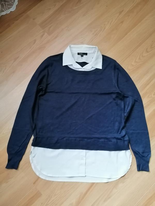 Комбинированный стильный джемпер, воротник отстёгивается, спинка 65 см, трикотажная часть 49 см, плечи 36 см, подмышки 46 см, рукав 60 см.