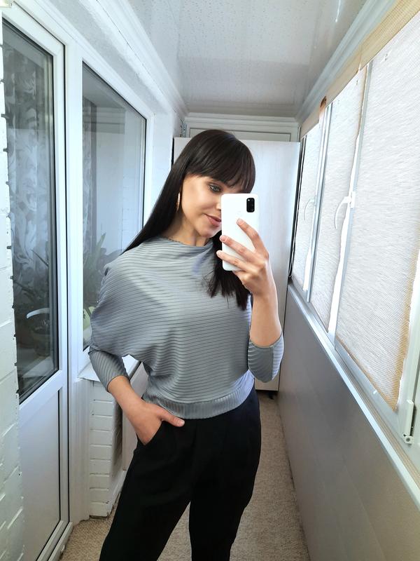 💜 Кофтинка фасоном "летюча миша" 💜 Дуже гарно ошатно дивуватися 😍 На спині невеликий виріз. 💙 Склад: 97% поліестер, 3% еластан. 💙 Розмір 10(М). Заміри: 🧡 поп - 41см; 🧡 довжина від плеча - 45см; 🧡 рукав від шиї - 70см.