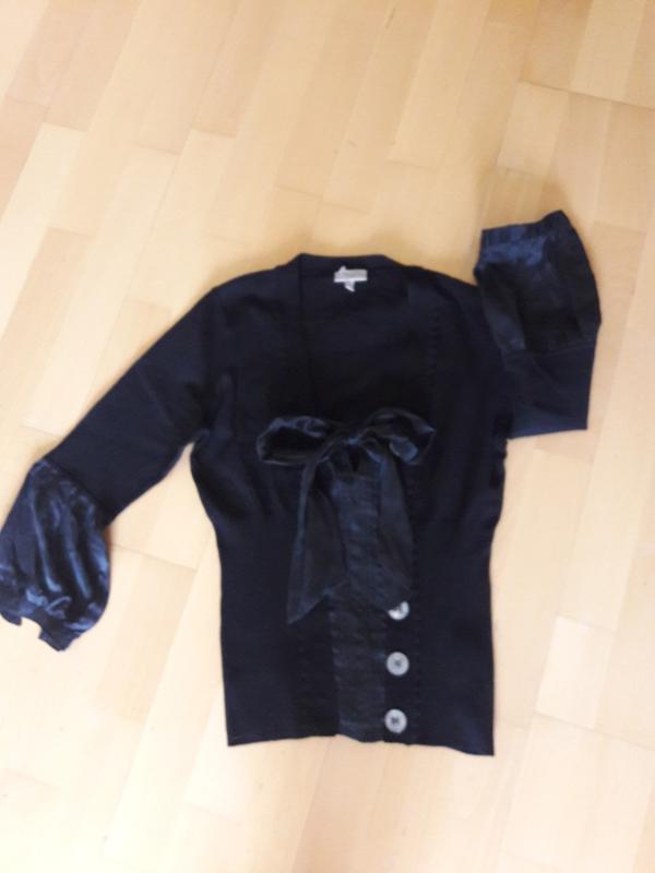 Нарядная кофта. Состав вискоза 70 %, полиестер 30 %. Отдельные детали ( бант и рукава внизу - шелк 100%. Есть катышки на полотне. Плечи 34. ПОГ 43 см. Длина 58 см. Высота резинуи внизу 20 см.
