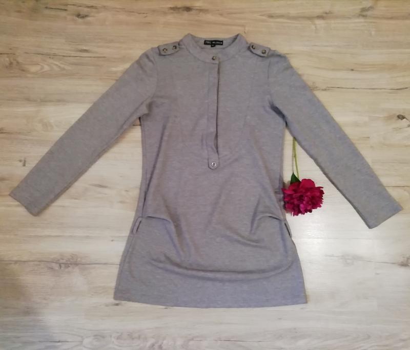 Стильна, зручна туніка Millennium з "пагонами" Розмір : M - L Колір: сірий Стан : Ідеальний Склад : 100% поліестер На стегнах є петельки під пояс Попереду на гудзиках, схованих Дефектів немає! Від плеча до плеча - 38см, довжина Рукава від плеча по зовнішній стороні - 60см, ПО грудях - 45-46см, довжина виробу - 79 см.. З додаткових питань пишіть}