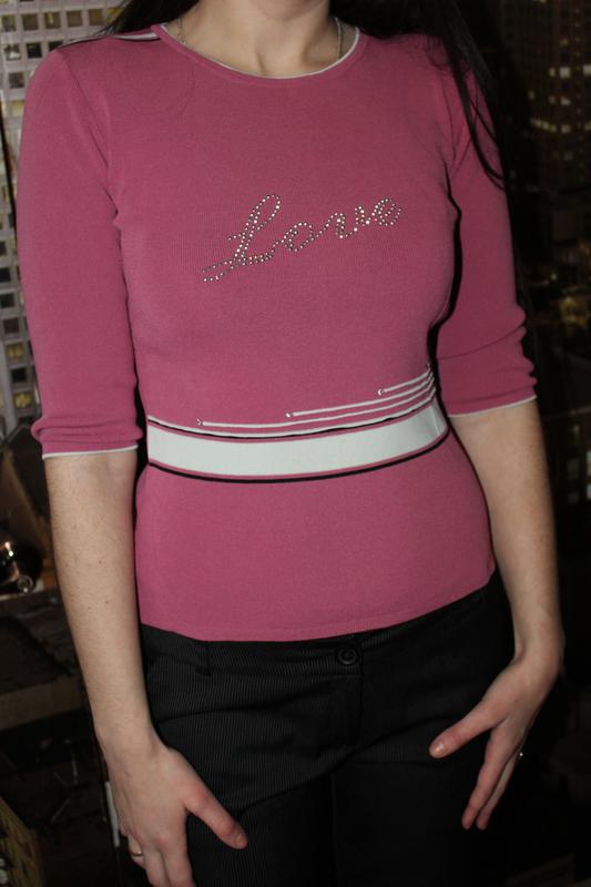 Кофточка в хорошому стані. Ніжно рожевого кольору, колір освіжаючий, рукав 3/4, дуже добре тягнеться, підійде на розмір 44-48. Довжина 52 див. Кофта хорошої якості, буде довго носитися. З нюансів, немає одного стразика, видно на фото.