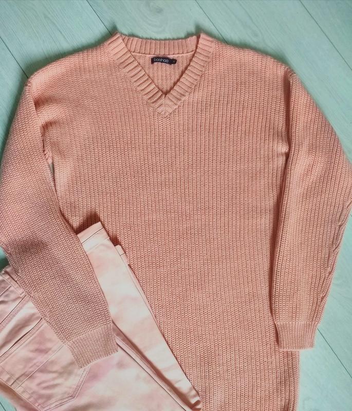 Приємного персикового кольору, приємний до тіла ( акрил). Наш розмір 46. Якщо любите оверсайз то на 44, якщо щоб строго по фігурці 48. Добре прикриває нижню частину спини. Заміри : довжина виробу 85, ПОГруди 50 не розтягуючи.