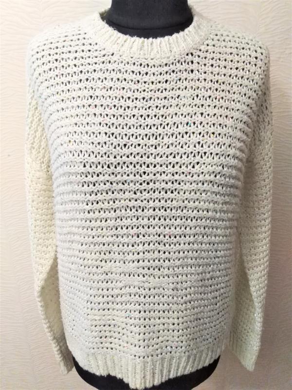 Замечательная нарядная кофточка молочного цвета (ближе к белому). По всей кофточке вплетена люрекс - нить и мелкие паетки. Из нюансов - сшитые между собой рядки (см.фото спинка и перед), в цене все учтено,абсолютно не бросается в глаза, вида не портит , кофточка выглядит празднично и нарядно. Длина перед 57 см, спинка 61 см, плечи 59 (приспущены), рукав 55, грудь 56. Всем удачных покупок.